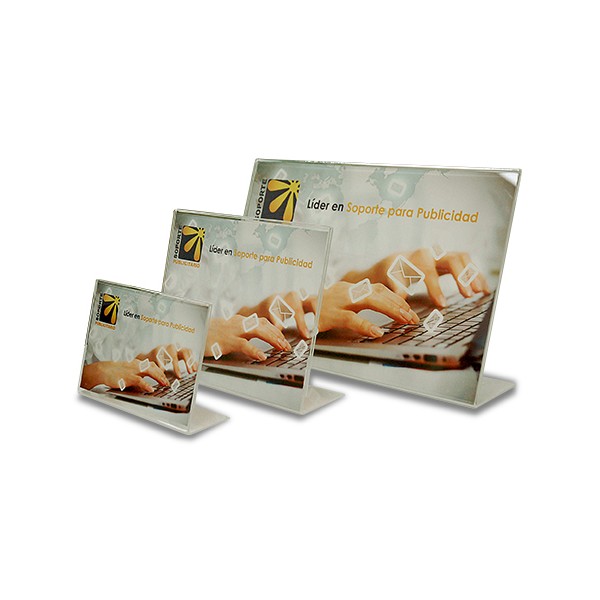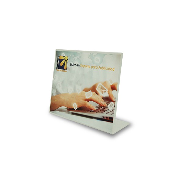 El porta-gráfica acrílico "L" horizontal formato doble carta (43,2 * 55,8cms) puedes combinarlo con gráfica en papel sintético o puedes imprimirlo personalmente en una impresora de carro ancho.